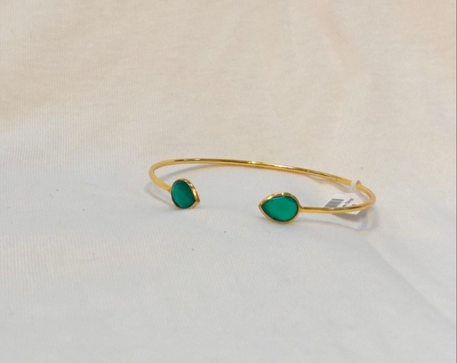 ティアドロップ型にカットされた大粒のグリーンオニキスが入ったバングルです。 華奢でシンプルなデザインなので手元を女性らしく見せてくれます。 半透明ながら濃くて鮮やかなグリーンの石がゴールドと合わさってレトロな印象もあります。カジュアルにもドレスシーンにも差し色として映えます。 バングル部分はステアリングシルバーにゴールドメッキで、オープンデザインなのでどなたでも着け外しがしやすくなっています。 他のバングルとの重ねづけも楽しめます♪ ☆グリーンオニキスの効果 ストレスを優しく癒してくれ、心を浄化してくれます。逆転や復活するときのお守りとして、成功に導いてくれる効果があります。 ※写真4枚目は他のバングルを重ねづけしたイメージです。 ※ステアリングシルバーは柔らかい素材なので輪を広げたり縮めたりできますが強く曲げないでください。 ※天然石のため色合いは一点ずつ微妙にことなります。ご了承ください。