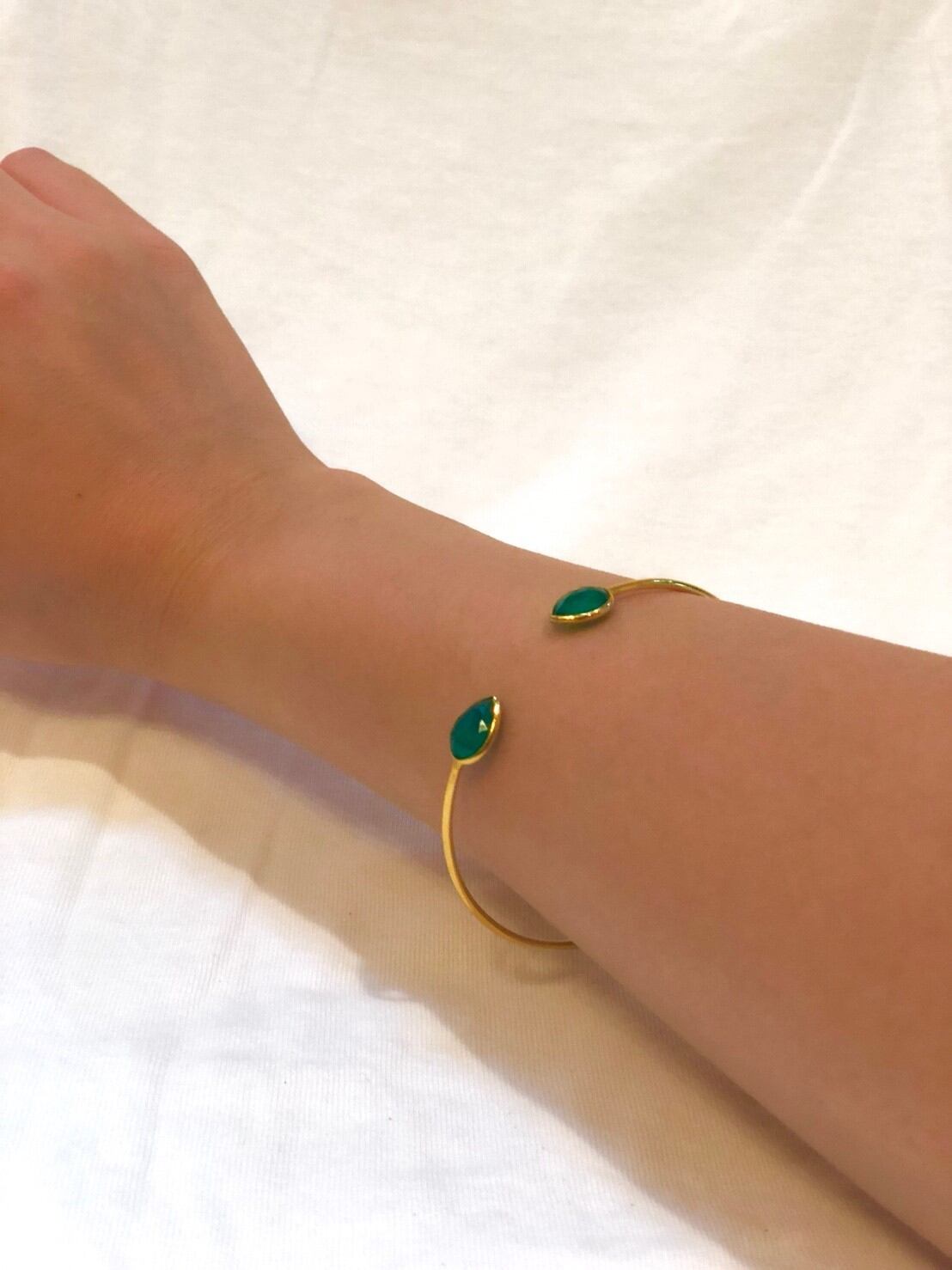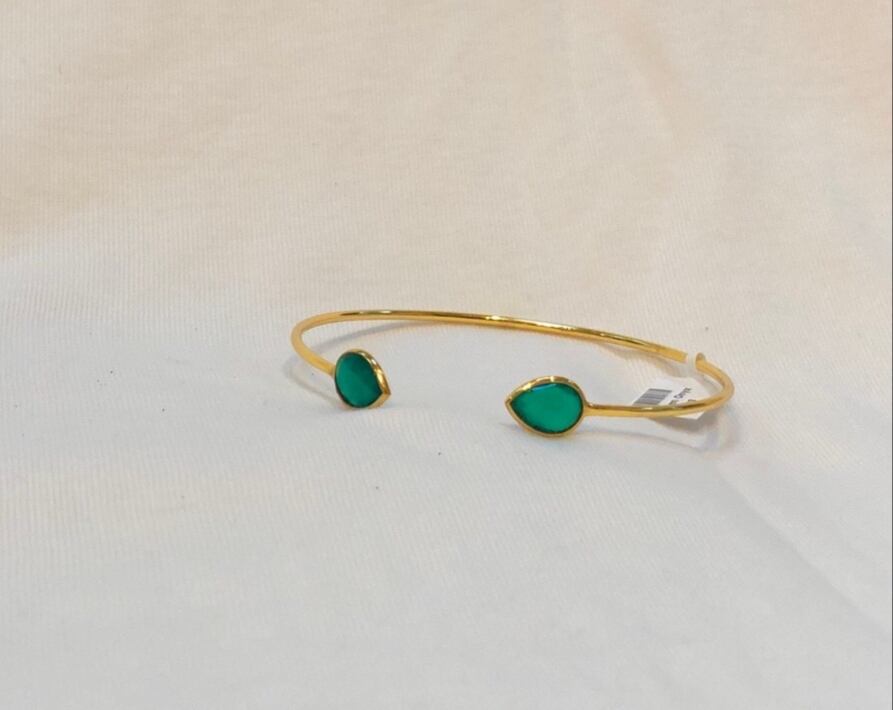 ティアドロップ型にカットされた大粒のグリーンオニキスが入ったバングルです。