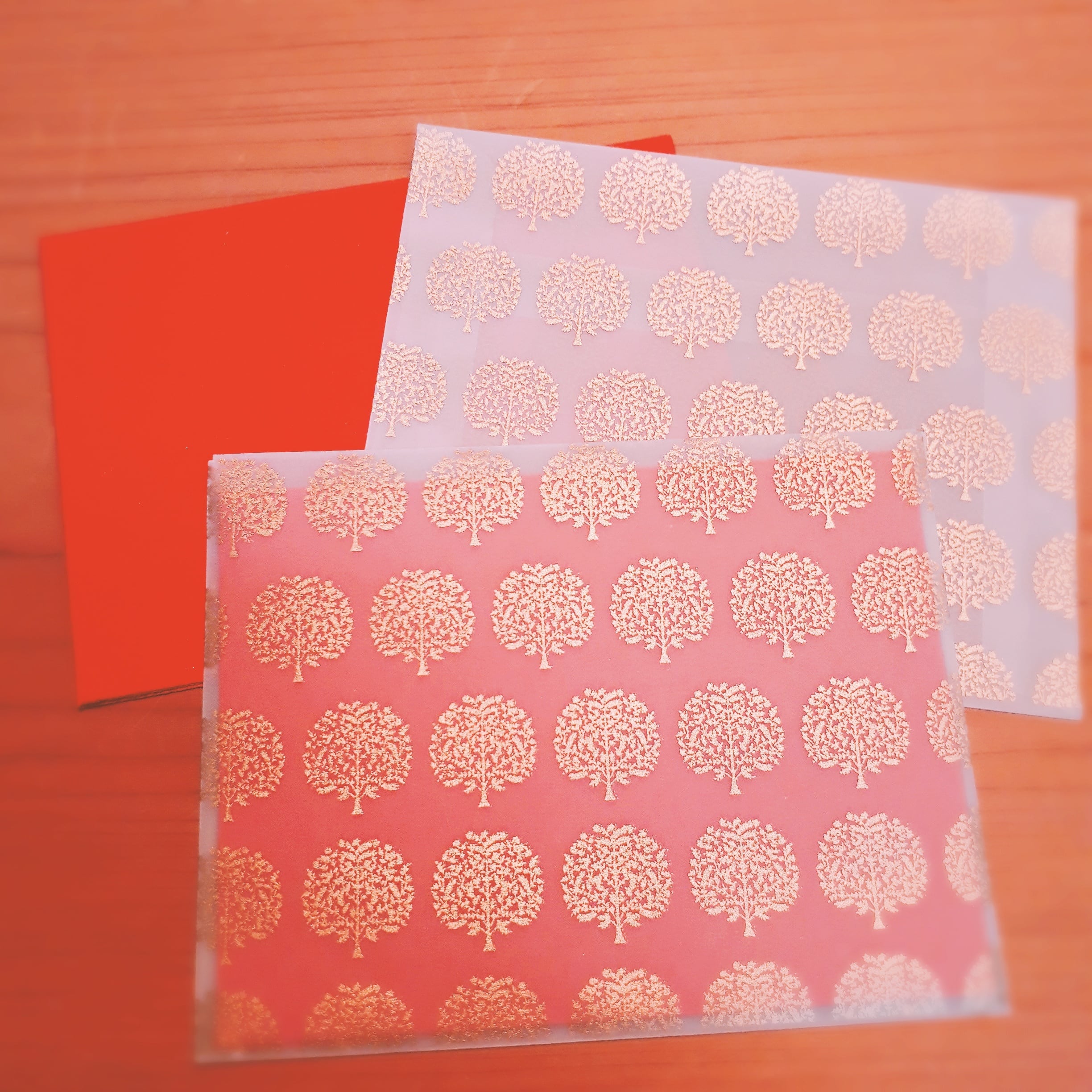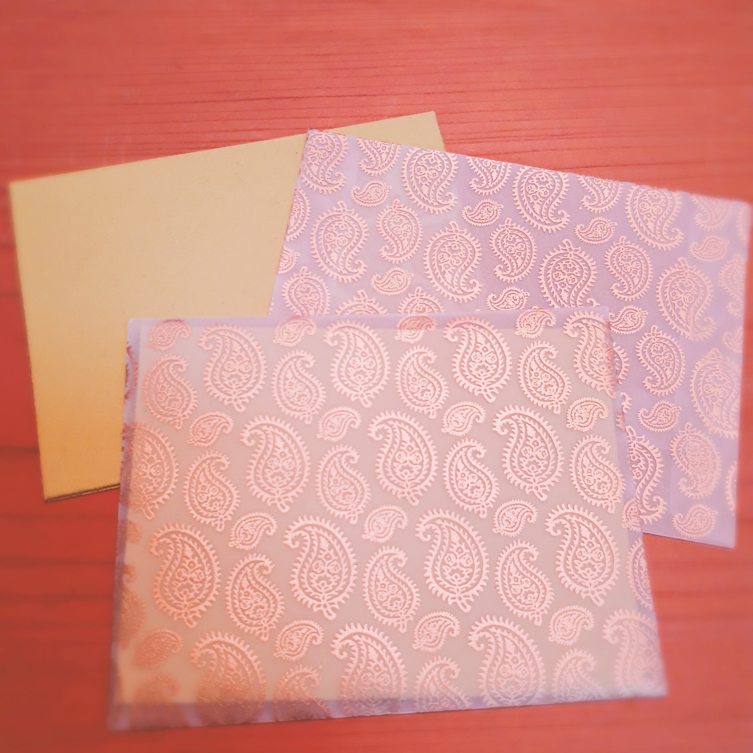 二つ折りのカラフルな無地のミニカードとエスニック柄のシースルー封筒がセットで、中のカードの色が程よく透けて大人っぽいデザインです✨