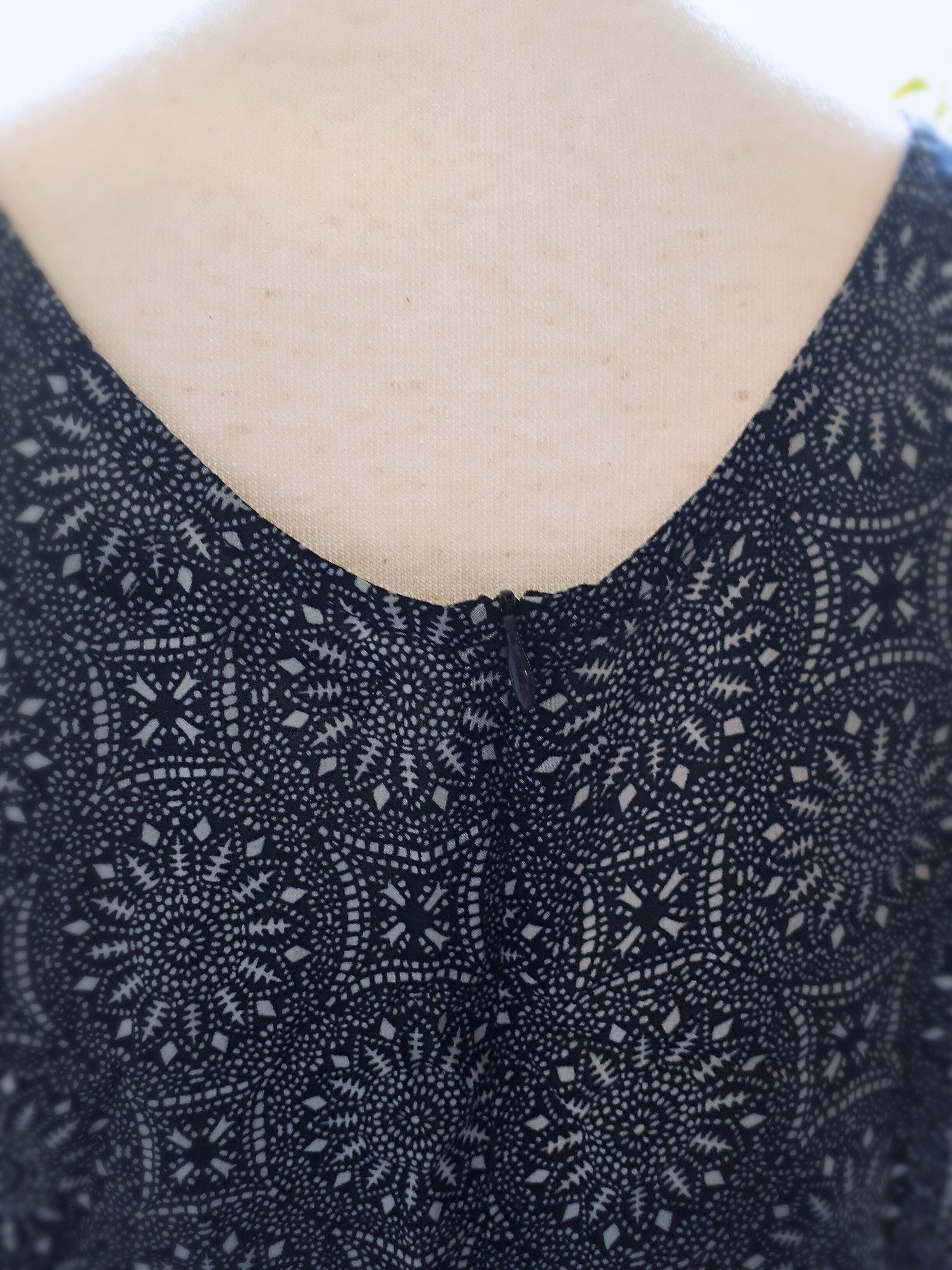 背中はファスナーで開閉できるので脱ぎ着も楽にできます。ウエストにフリンジ付きの紐が入ってるのでブラウジングして着られます。