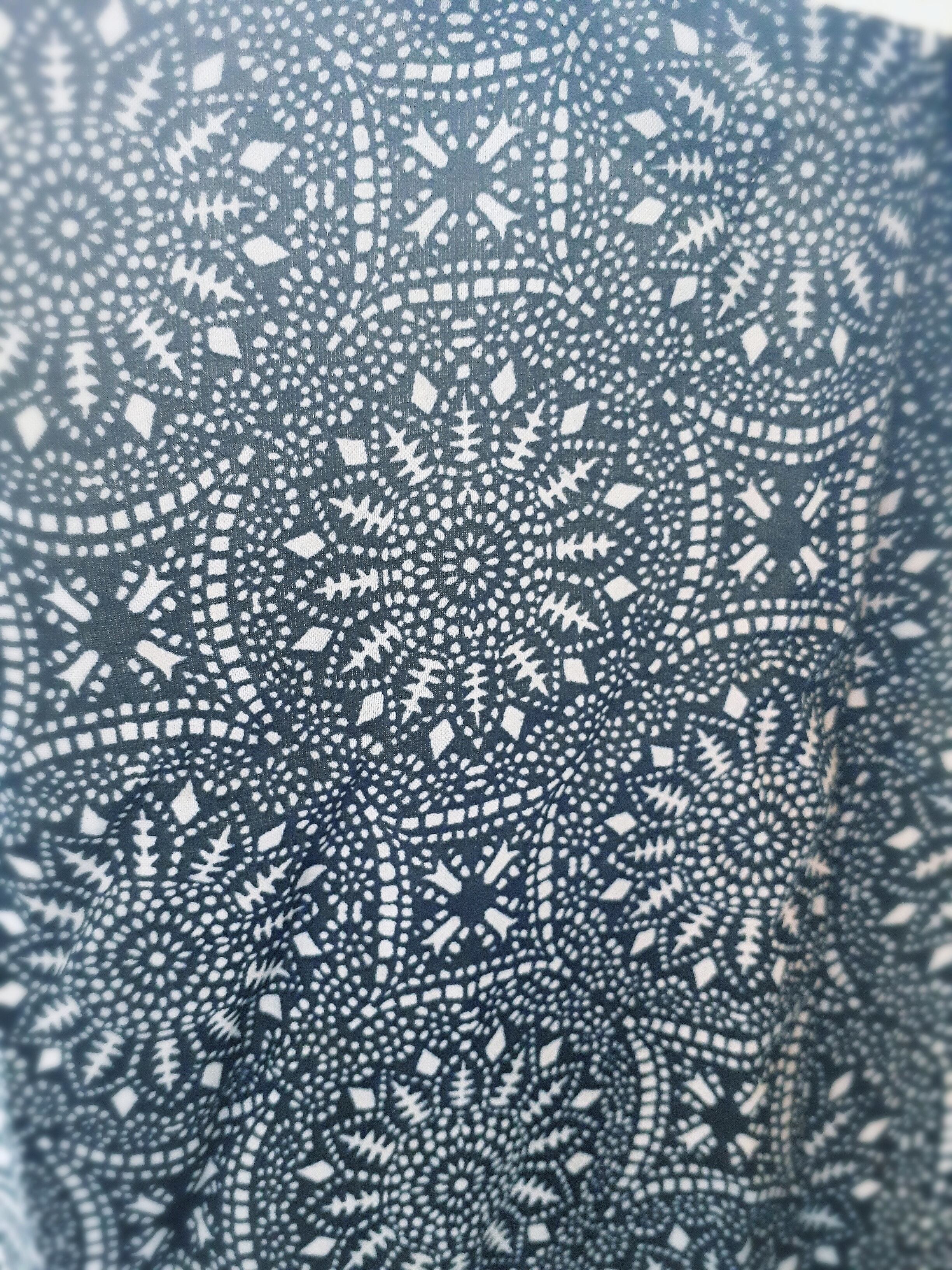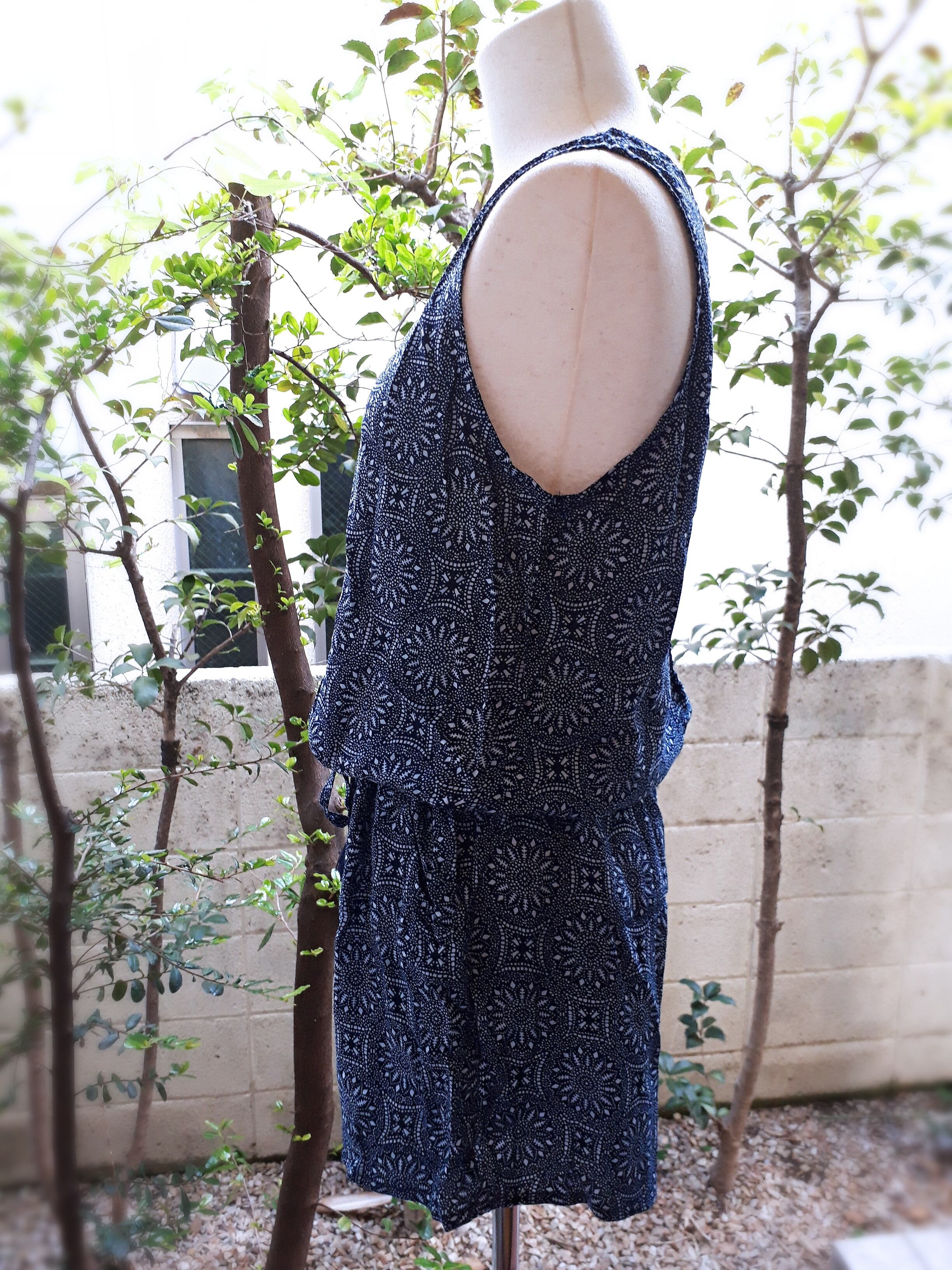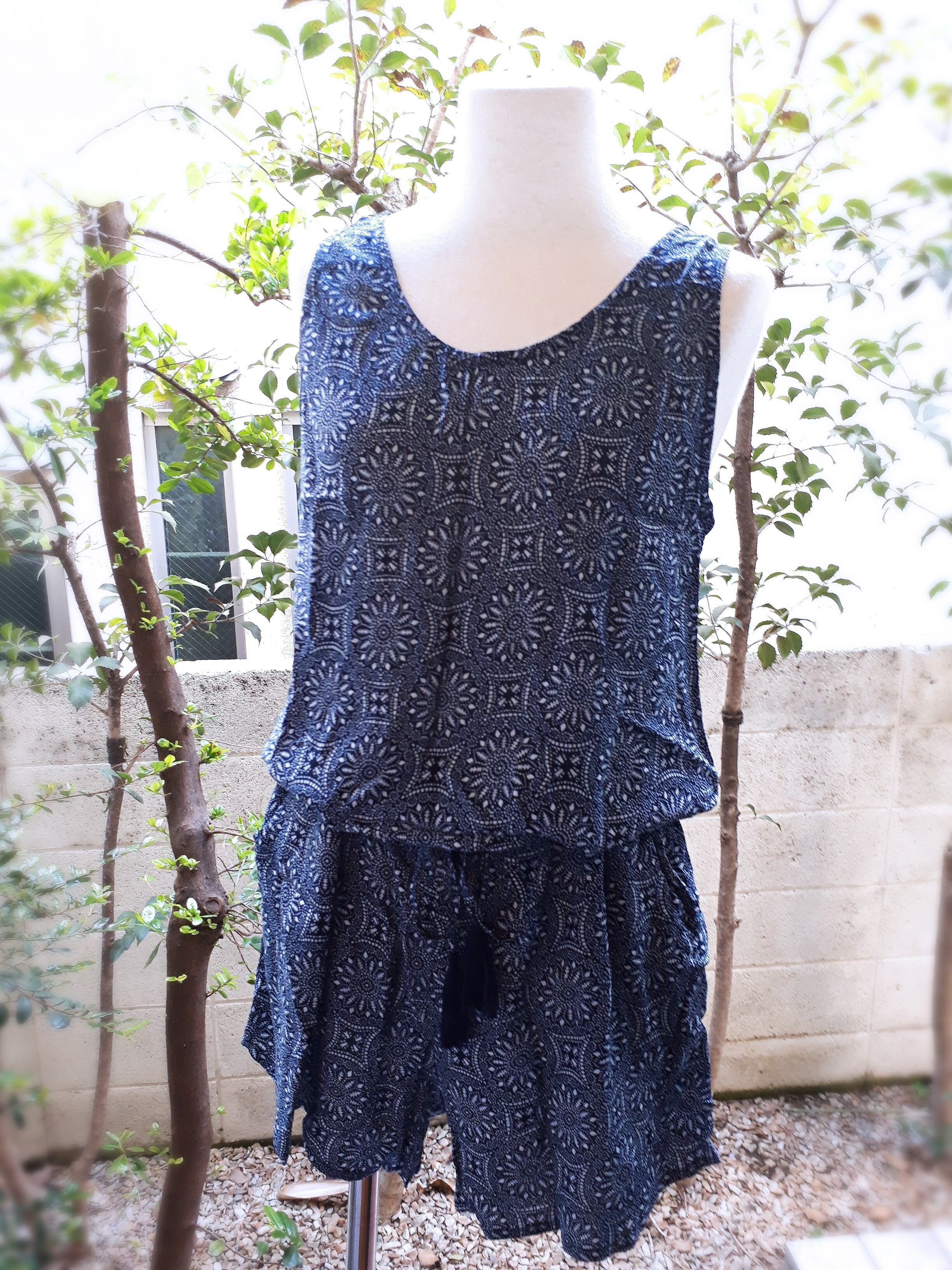 落ち着いたネイビーカラーの大人でも着られるロンパースです。こちらはバリ島伝統のバティック柄風プリントでエスニックな雰囲気です。